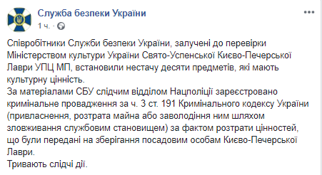 По данным ведомства, сотрудники Службы безопасности Украины, привлеченные к проверке Министерством культуры Украины Свято-Успенской Киево-Печерской Лавры УПЦ МП, действительно установили, что не хватает десяти предметов, представляющих культурную ценность.
