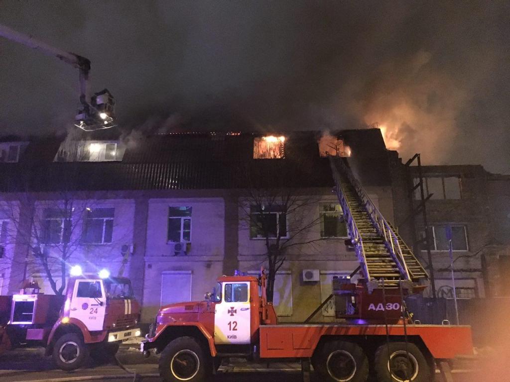 "9 февраля в 23:08 в оперативно-координационный центр Главного управления ГСЧС Украины в г. Киеве поступило сообщение о пожаре в трехэтажном офисном здании на ул. Казимира Малевича, 86-г, что в Голосеевском районе. По прибытию первых пожарно-спасательных подразделений было установлено, что возгорание произошло на третьем мансардном этаже с распространением огня на кровлю здания", - сообщили спасатели.