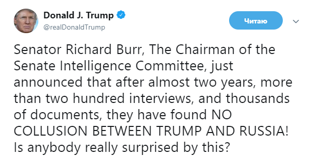 "Сенатор Ричард Берр, глава комитета по разведке, только что сообщил, что после почти двух лет (расследований - Прим.Ред.), более двухсот интервью и тысяч документов, они (комитет – Прим.Ред.) не обнаружили никакого тайного сговора между Трампом и Россией! Хоть кто-нибудь действительно удивлен этим?", - написал Трамп в сети.
