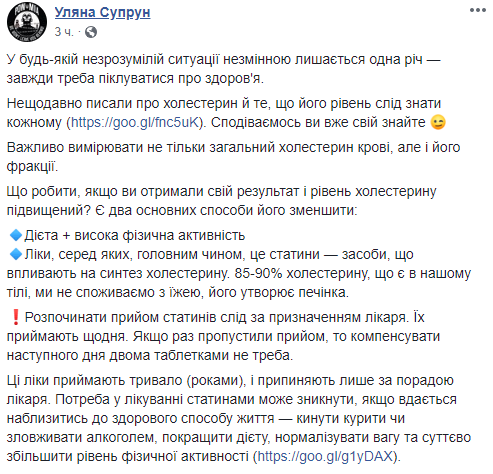 Если холестерин не в норме, то прежде всего врач должен посоветовать изменения в образе жизни. Прием статинов может быть рекомендован, если эти меры не помогают. Лучше контролируйте свой уровень холестерина регулярно, чтобы он потом не контролировал вашу жизнь, советует Супрун.