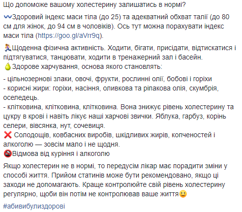 Для поддержания нормального уровня холестерина в крови необходимо поддерживать здоровое питание и заниматься спортом. Об этом глава Минздрава написала на своей странице в Facebook.