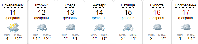 По данным сайта Sinoptik.ua, всю неделю дневная температура продержится на уровне 0...+2, ночью до -4...+1. Осадки в виде дождя со снегом обещают 12, 13, 14 и 15 февраля. На выходных будет пасмурно, без осадков.