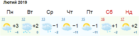 Сайт Укргидрометцентра обещает до +2...+4 в понедельник и пасмурную погоду. В вторник днем +1...+3, дождь со снегом. Со среды немного похолодает, днем термометры покажут до -1...+1. Такая температура продержится до выходных. На День Валентина, 14 февраля, синоптики прогнозируют небольшой мороз до -1 днем, может срываться небольшой снег. Ночью 14 и 15 февраля похолодает до -5...-7.