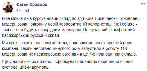 В сообщении говорится, что  благодаря новому составу увеличили  периодичность курсирования поезда в Лисичанск. Поезд вышел на маршрут 5 февраля. "Это современный и комфортный пассажирский подвижной состав", - сообщает Евгений Кравцов.