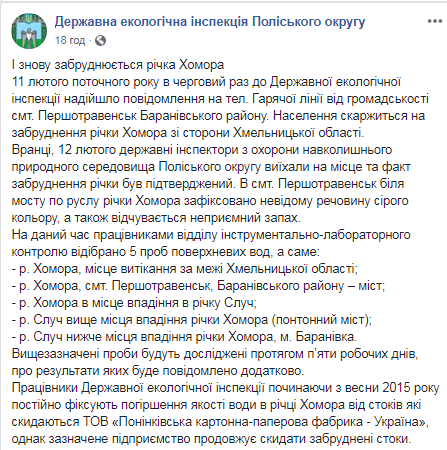 "11 февраля в Государственную экологическую инспекцию поступило сообщение от жителей пгт Первомайск Барановского района. Население жалуется на загрязнение реки Хомора со стороны Хмельницкой области. Утром, 12 февраля государственные инспекторы по охране окружающей среды выехали на место и факт загрязнения реки был подтвержден.