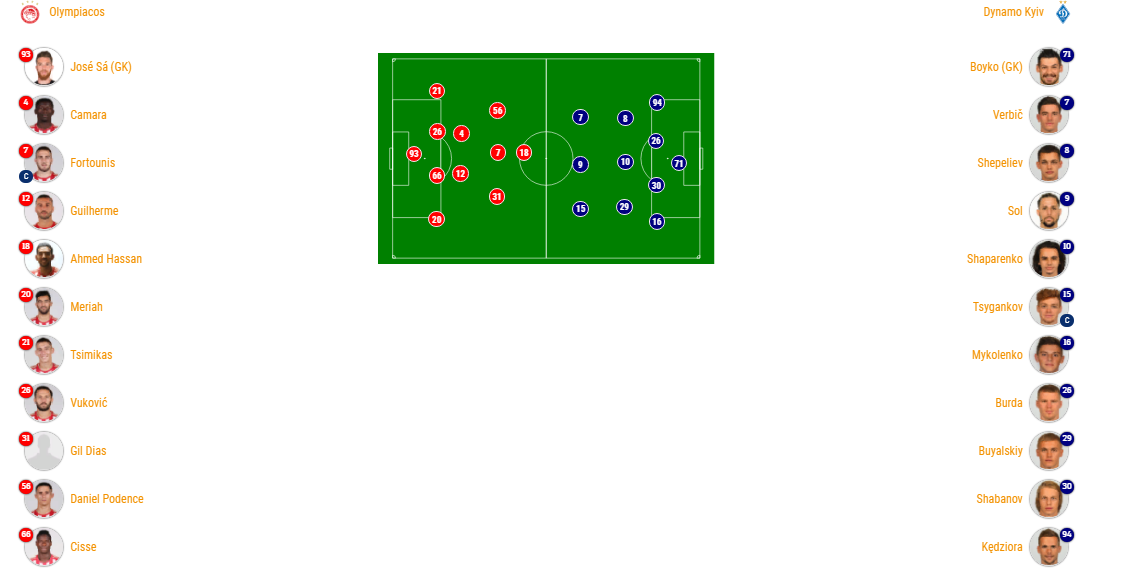 19:54 Схемы: 4:2:3:1 "Олимпиакоса" против 4:3:3 "Динамо"
