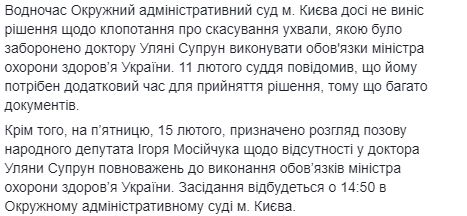 Сам иск по существу рассмотрят 15 февраля. Тогда суд решит, отменить ли собственное постановление о запрете Супрун исполнять обязанности министра - или же окончательно утвердить его.