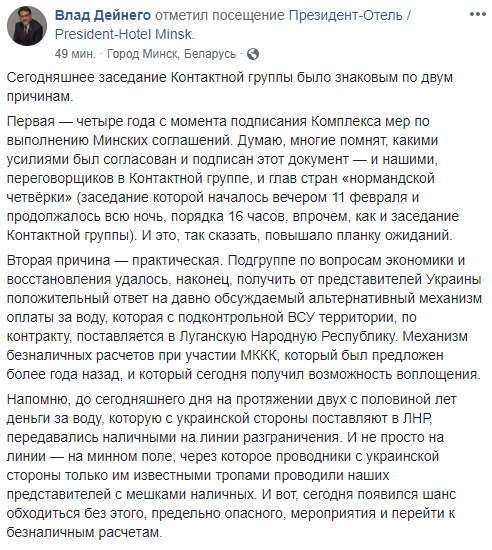 Уполномоченный представитель т.н. "ЛНР" в Минской контактной группе по урегулированию конфликта на Донбассе Владислав Дейнега заявил, что с территории Луганской области, неподконтрольной Украине, теперь за воду будут платить безналичным платежом.