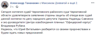 Сегодня коллегия судей Черниговского районного суда удовлетворила заявление стороны защиты об отводе всех судей данной коллегии по делу народного депутата Украины Надежды Савченко и экс-руководителя Центра освобождения пленных "Офицерский корпус" Владимира Рубана, которым вменяют действия, направленные на насильственное изменение или свержение конституционного строя или на захват государственной власти. Об этом сообщил на своей странице в адвокат Александр Тананакин.