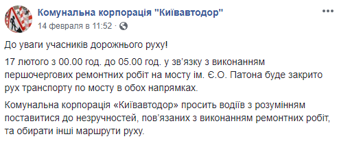 В Киеве сегодня ночью, 17 февраля, движение по мосту Патона полностью перекроют в связи с выполнением первоочередных ремонтных работ. Об этом сообщает пресс-служба корпорации "Киевавтодор" в Facebook.
