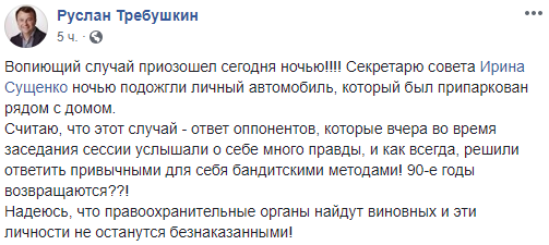 "Вопиющий случай произошел сегодня! Секретарю совета Ирине Сущенко ночью подожгли личный автомобиль, который был припаркован рядом с домом. Считаю, что этот случай - ответ оппонентов, которые вчера во время заседания сессии услышали о себе много правды, и как всегда, решили ответить привычными для себя бандитскими методами", - написал он.