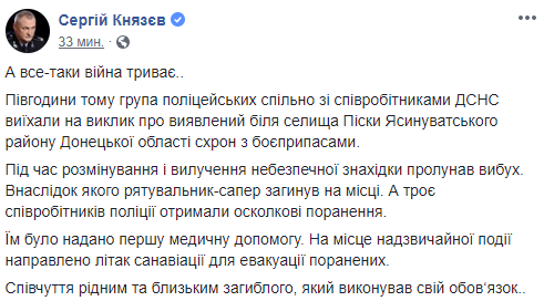 "Полчаса назад группа полицейских совместно с сотрудниками ГосЧС выехали на вызов об обнаруженном возле поселка Пески Ясиноватского района Донецкой области схроне с боеприпасами. При разминировании и изъятии опасной находки раздался взрыв", - рассказал он.