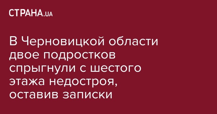 В субботу, 16 февраля, два подростка выпрыгнули с шестого этажа недостроенного здания в городе Сторожинец Черновицкой области. Полицейские обнаружили ребят с телесным повреждениями характерными для падения с высоты около 10:00. Один из парней был без признаков жизни. Другой находился без сознания. Об этом сообщает пресс-служба Черновицкой области.