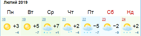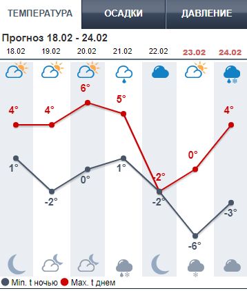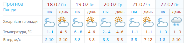 Сайт Укргидрометцентра прогнозирует практически весеннее тепло в начале недели. С понедельника по среду днем пригреет до +4...+6. При этом ночью обещают температуру ниже нуля: до -2...-6. С четверга дневная температура опустится до -1...+1, а в пятницу градусники покажут  -1...-3 днем. Что касается осадков, то среди недели обещают переменную облачность без осадков, 22 февраля - снег.