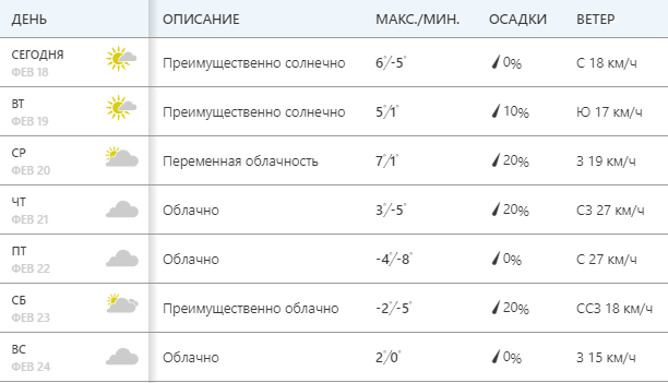 Сайт Weather.com сообщает, что первые три дня недели будут солнечными и теплыми до +5...+7. В четверг небо затянут тучи и станет чуть прохладнее: до +3 днем. А в пятницу и субботу обещают морозный всплеск. Днем температура опустится до -2...-4. Однако уже в воскресенье воздух прогреется до +2 днем.