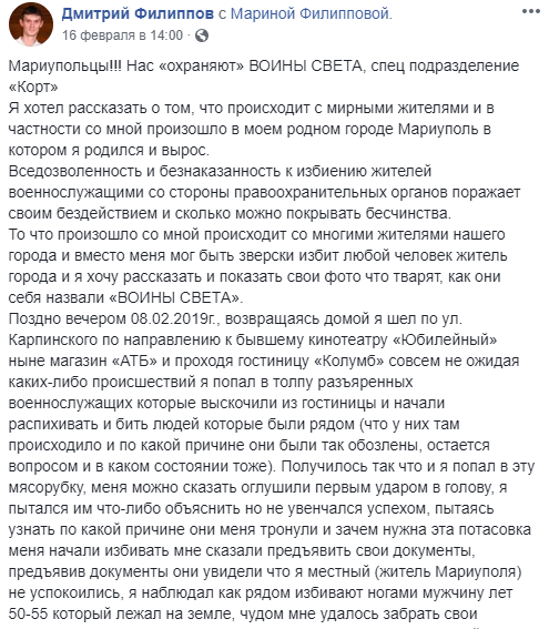 Парня начали избивать и требовать, чтобы он предъявил свои документы. Но увидев, что перед ними - житель Мариуполя, военные не успокаивались. "Я наблюдал, как рядом избивают ногами мужчину лет 50-55, который лежал на земле, чудом мне удалось забрать свои документы, после чего еще последовали удары в голову, по всей видимости, они удовлетворили свои звериные потребности. Как мне удалось оттуда уйти живым и при этом прихватить этого мужчину я просто не знаю и не помню из-за сильного сотрясения мозга и шокового состояния", - пишет Филиппов.