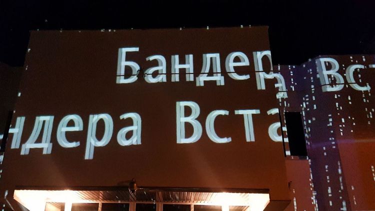 18:53  Пришли под здание МВД на Богомольца, 10 и устроили графический перфоманс на его стенах. Там появилась надпись "Бандера, вставай!".