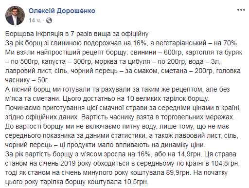 "Чтобы приготовить борщ понадобится 600 граммов свинины, по 500 граммов картофеля и свеклы, 300 граммов капусты, по 200 граммов моркови и лука, вода, лавровый лист, соль, черный перец, сметана, чеснок. В январе 2018-го за необходимое количество свинины платили 66 гривен, 2019-го - 70 гривен, свидетельствуют данные Госкомстата. Свинина подорожала на 6% ", - отмечается на Фейсбук-странице Дорошенко.