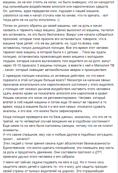 "Несмотря на наличие явных признаков алкогольного или наркотического состояния у этого водителя, у полиции нет никаких рычагов воздействия заставить этого человека сдать анализ крови на показатели алкоголя или наркотиков в крови! Нашим законом это никак не регламентировано. Человек, который влетел в лоб нашей машины и потом еще 10 минут ее таранил в то время, когда в машине была я и вся моя семья, отказался сдавать анализы, и это все, что можно было зафиксировать", - возмущается София.