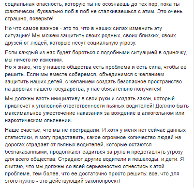 Но я знаю, что у нашего общества есть проблема и есть сила, чтобы ее решить. Если мы вместе соберемся, объединимся с желанием защитить наших детей, с желанием создать безопасное пространство на дорогах нашего государства, у нас обязательно получится! Мы должны взять инициативу в свои руки и создать закон, который привлечет к уголовной ответственности пьяных водителей! Должно быть максимальное ужесточение наказания за вождение в алкогольном или наркотическом опьянении", - утверждает бизнесвумен.