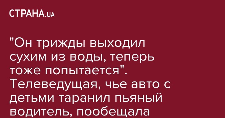 После того как нетрезвый водитель Touareg сначала врезался, а потом 10 минут таранил автомобиль с ее детьми, экс-телеведущая и бизнесвумен София Кудина приняла решение инициировать всеукраинскую кампанию за ужесточение ответственности за пьяное вождение. Об этом она сообщила в комментарии "Стране".
