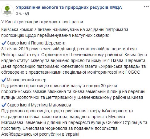 Кроме того, по случаю 30-летия братских связей Мюнхена и Киева земельный участок на пересечении Зоологической и Дегтяревской улиц получил название Мюнхенский сквер. А на перекрестке улицы Сечевых Стрельцов и проспекта Вячеслава Чорновола по представлению посольства Азербайджана учредят Сквер имени Муслима Магомаева - народного артиста, оперного и эстрадного певца СССР.