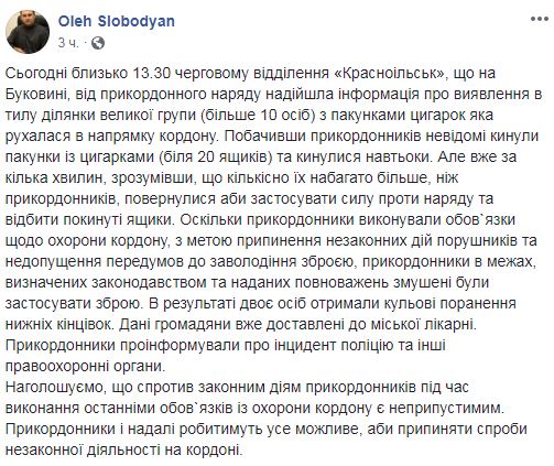 Пограничники отдела "Красноильск", патрулировавшие участок украинско-румынской границы, применили оружие, чтобы остановить нападение контрабандистов, в результате были ранены два человека. Об этом сообщил на своей странице в Facebook пресс-секретарь Госпогранслужбы Олег Слободян.