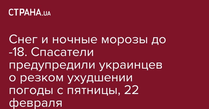 "22-24 февраля ожидается изменение погодных условий. 22 февраля в западных, южных, Житомирской, Винницкой, Кировоградской и Донецкой областях умеренный снег (восстановление снежного покрова высотой 1-6 см), местами налипание мокрого снега, в Карпатах значительный снег. Понижение температуры в Украине ночью до 3-10 градусов мороза, днем ​​до 0-6 градусов мороза", - уточнили в ГСЧС.