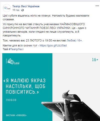 "В этом году 23 февраля в 19:00 мы вместе со всеми нашими зрителями и зрительницами установим собственный рекорд в честь Леси Украинки! В этот день состоится самое массовое синхронное чтение ее поэзии - стихотворения Contra spem spero - во время спектакля "Любовь". Театр Леси Украинки приглашает стать частичкой такого нерядового события!" - заявили в театре.
