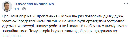 "Представителем УКРАИНЫ (так у автора - ред.) не может быть артист, который гастролирует в государстве-агрессоре и планирует делать это и в дальнейшем и не видит в этом ничего неприемлемого. Поэтому история с участником от Украины еще далеко не завершена", - многозначительно написал он.