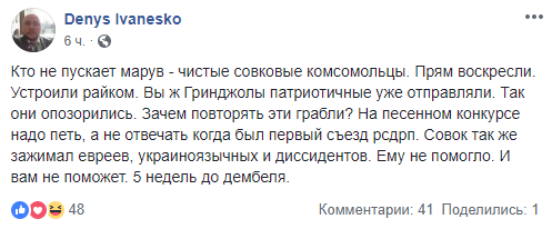 "Устроили райком. Вы ж Гринджолы патриотичные уже отправляли. Так они опозорились. Зачем повторять эти грабли? На песенном конкурсе надо петь, а не отвечать когда был первый съезд рсдрп. Совок так же зажимал евреев, украиноязычных и диссидентов. Ему не помогло. И вам не поможет. 5 недель до дембеля", - написал Иванеско.
