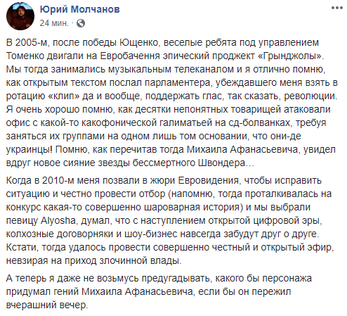"Мы тогда занимались музыкальным телеканалом и я отлично помню, как открытым текстом послал парламентера, убеждавшего меня взять в ротацию "клип" да и вообще, поддержать глас, так сказать, революции. Я очень хорошо помню, как десятки непонятных товарищей атаковали офис с какой-то какофонической галиматьей на сд-болванках, требуя заняться их группами на одном лишь том основании, что они-де украинцы! Помню, как перечитав тогда Михаила Афанасьевича, увидел вдруг новое сияние звезды бессмертного Швондера…", - вспоминает Молчанов.