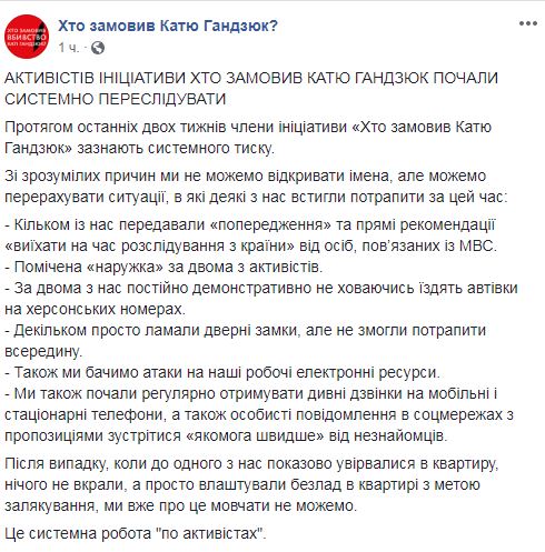 "В течение последних двух недель члены инициативы "Кто заказал Катя Гандзюк" терпят системное давление", - отметили в соцсети активисты, не называя имен.