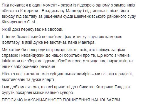 Активисты утверждают, что осмелились заявить о давлении публично после того, как в квартиру к одному из них "показательно ворвались, ничего не украли, а просто устроили беспорядок с целью запугивания". Они сообщают, что начались преследования "в один момент", когда объявили о подозрении одному из заказчиков убийства Гандзюк председателю Херсонского облсовета Владиславу Мангеру. Отмечается, что давление усилилось после выхода Мангера под залог. "Мы хотели бы предупредить общественность о том, что никто из членов инициативы не хранит дома оружия массового уничтожения, наркотиков и других запрещенных веществ. Никто из нас также не имеет суицидальных намерений", - говорится в заявлении активистов.