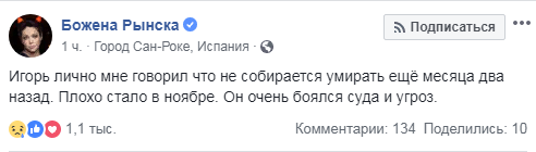 "Игорь лично мне говорил что не собирается умирать ещё месяца два назад. Плохо стало в ноябре. Он очень боялся суда и угроз", - указано на ее Фейсбук-странице.