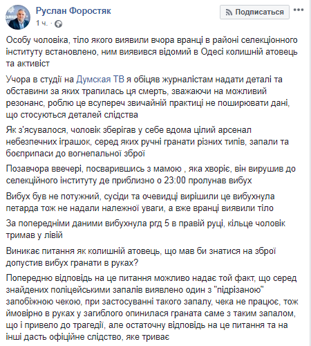 "По предварительным данным, взорвалась РГД-5 в правой руке, кольцо мужчина держал в левой. Возникает вопрос как бывший атошник, который должен разбираться в оружии, допустил взрыв гранаты в руках?.. Среди найденных полицейскими запалов обнаружен одна "подрезанная" предохранительная чека, при применении такого запала, чека не работает", - написал Форостяк.