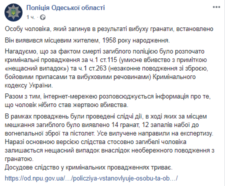 По данным спикера Главного управления Национальной полиции в Одесской области Руслана Форостяка, погибший хранил у себя дома целый арсенал, среди которого - ручные гранаты различных типов, взрыватели и боеприпасы к огнестрельному оружию.