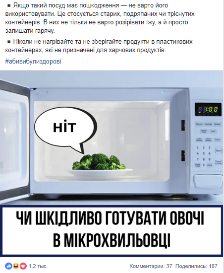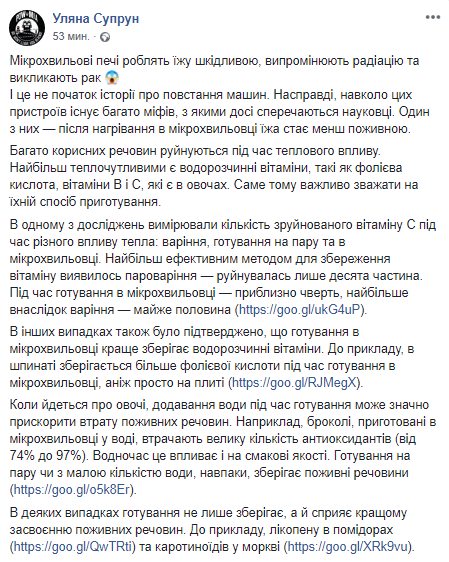Еда, приготовленная в микроволновке, сохраняет больше витамина С и водорастворимых витаминов, чем сваренная. Об этом на своей странице в Facebook написала глава Минздрава Ульяна Супрун.