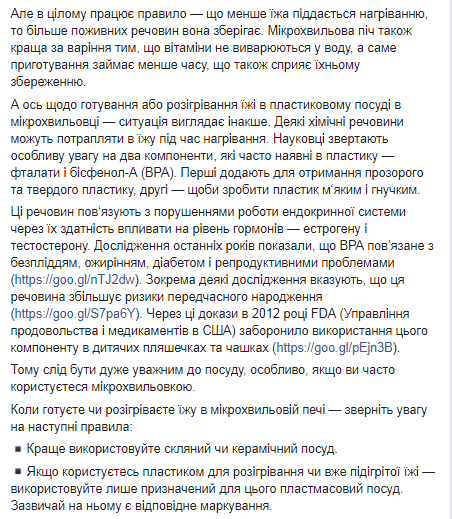 Впрочем, Супрун напоминает, что в целом работает правило - чем меньше пища подвергается нагреванию, тем больше питательных веществ она сохраняет. По ее словам, стоит учитывать, что использование пластиковой посуды в микроволновке может нанести вред. Некоторые химические вещества могут попадать в пищу во время нагревания. Поэтому следует быть очень внимательным к посуде, особенно, если вы часто пользуетесь микроволновкой.