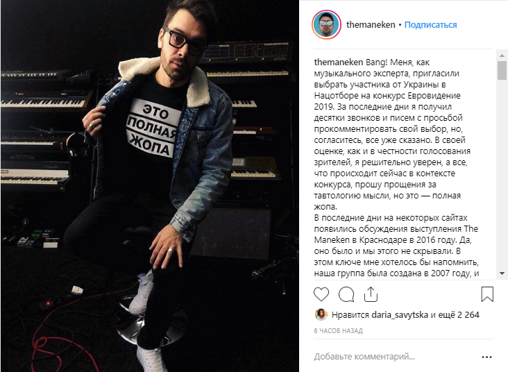 "Bang! Меня, как музыкального эксперта, пригласили выбрать участника от Украины в Нацотборе на конкурс Евровидение 2019. За последние дни я получил десятки звонков и писем с просьбой прокомментировать свой выбор, но, согласитесь, все уже сказано. В своей оценке, как и в честности голосования зрителей, я решительно уверен, а все, что происходит сейчас в контексте конкурса, прошу прощения за тавтологию мысли, но это - полная ж*па. В последние дни на некоторых сайтах появились обсуждения выступления The Maneken в Краснодаре в 2016 году. Да, оно было и мы этого не скрывали. В этом ключе мне хотелось бы напомнить, наша группа была создана в 2007 году, и в нее входили музыканты из России и Украины. Три года назад мы отказались полностью от гастрольной деятельности на территории РФ. Нацотбор в 2019-м вызвал немало громких обсуждений острых в обществе вопросов, а вместе с тем и спекуляций. Логичный вопрос - с каких пор песенный конкурс стал самой важной темой в Украине?", - написал музыкант.