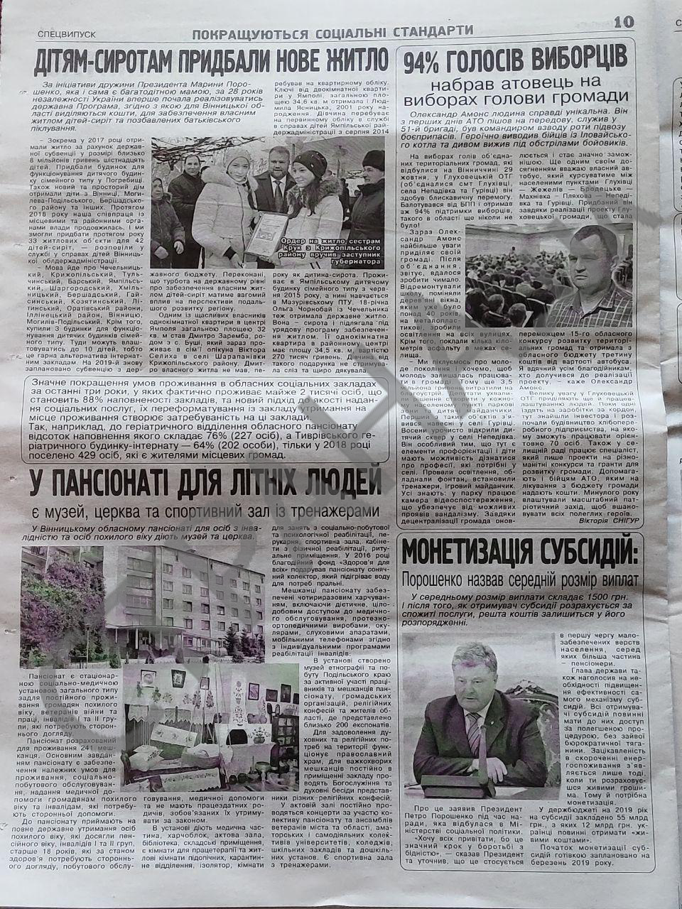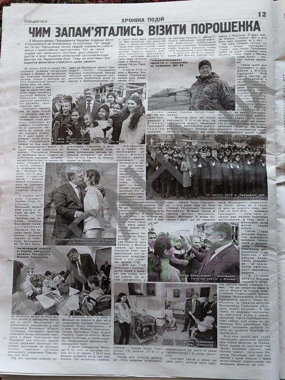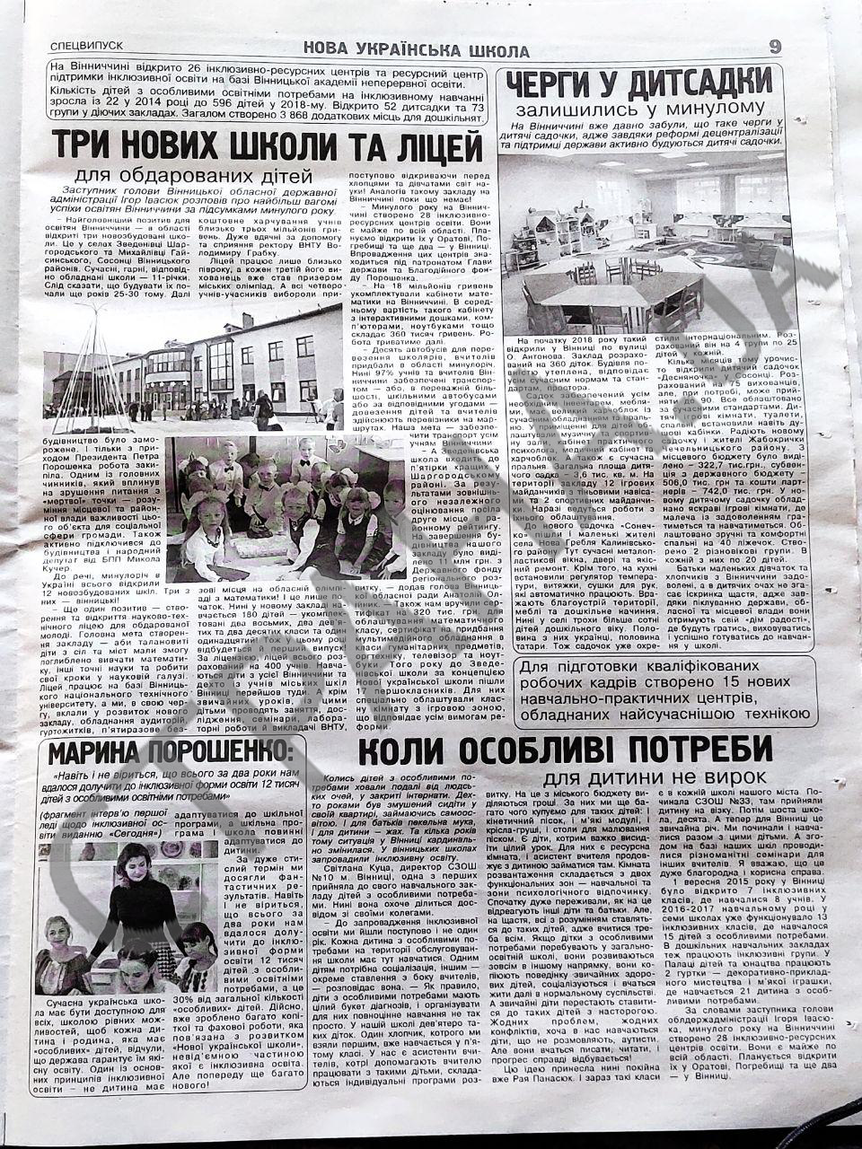 Из газеты Порошенко становится известно об открытии в Винницкой области трех школ и лицея, оставшихся в прошлом очередях в садиках, новом жилье для детей-сирот и семей бойцов АТО.