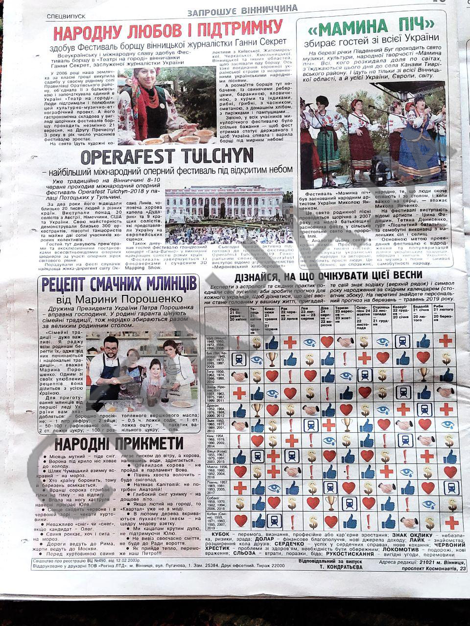 Отдельно в газете рассказывается о деятельности первой леди, приводится фото целующихся супругов Порошенко. Накануне Масленицы составлен специальный рецепт блинов от Марины Порошенко (см.предпоследнюю иллюстрацию).