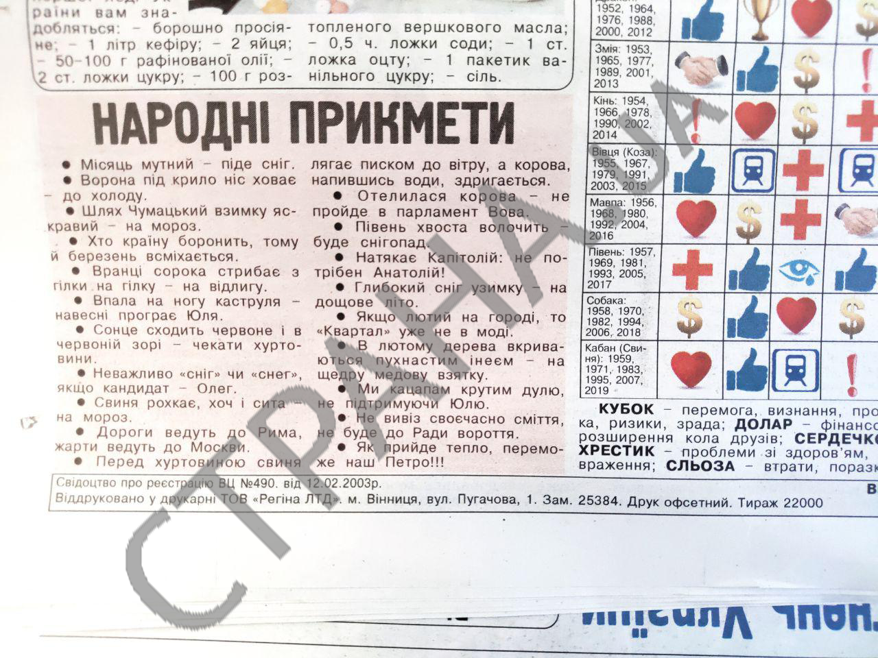 В качестве развлекательной минутки приводятся гороскоп и народные приметы (см.последнюю иллюстрацию). Они такие: "Месяц мутный - снег пойдет", "Упала на ногу кастрюля - весной проиграет Юля", "Ворона под крыло нос прячет - к холоду", "Отелилась корова - не пройдет в парламент Вова", "Намекает Капитолий: не нужен Анатолий", "Мы кацапам крутим дулю, не поддерживая Юлю", "Как придет тепло, победит наш Петро!"