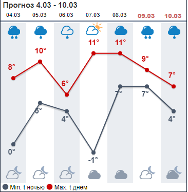 Ресурс Мeteoprog.ua обещает +8...+10 и дождь 4 и 5 марта. Среда, по данным этого ресурса, будет немного прохладнее, до +6 днем. В четверг-пятницу, 7 и 8 марта, потеплеет до +11, осадков не будет. Выходные будут мокрыми, дневная температура +7...+9.