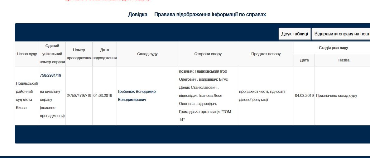 Ответчиками являются руководитель программы "Наші гроши" Денис Бигус и журналист-расследователь Леся Иванова. Дело будет рассматривать судья Владимир Гребенюк.