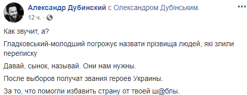"Гладковський-молодший погрожує назвати прізвища людей, які злили переписку.
