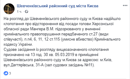 Шевченковский районный суд Киева получил на рассмотрение ходатайство об отстранении от должности председателя Херсонского облсовета Владислава Мангера, которого подозревают в организации убийства активистки Екатерины Гандзюк. Об этом на своей странице в Facebook сообщает пресс-служба суда.
