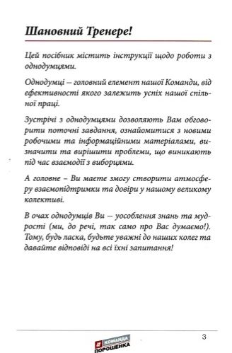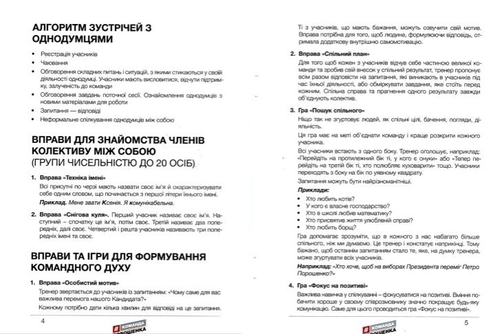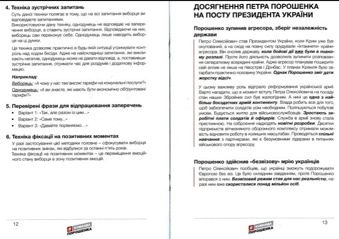 Авторы пособия называют агитаторов словом "единомышленники". В брошюре приводятся примеры тренировочных занятий с ними, а также варианты разговоров с избирателями. Основные темы – война на Донбассе, состояние экономики, пенсионная реформа, получение Украиной безвиза и томоса об автокефалии национальной православной церкви, обещание кандидата закрыть свой бизнес в России и т.д. Например, среди достижений Петра Порошенко, о которых нужно рассказать избирателям сказано, что "в планах Кремля было захватить почти половину Украины, но Порошенко смог дать жесткий отпор". Или, например, на вопрос о повышении тарифов нужно отвечать, что это были "необходимые меры для оздоровления ситуации в ЖКХ, которое десятилетиями страдало от деструктивной политики прошлых властей".