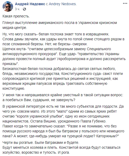 Блогер Андрей Недовес: "Глянул выступление американского посла в Украинском кризисном медиа-центре. Ну, что могу сказать - белая госпожа знает толк в извращениях. Слова дамы звучали, как удары кнута по голой спине стоящего рядом в позе сломанной березы. Нет, не березы- смереки. Щелчок кнута - "считаем целесообразным замену Специального антикоррупционного прокурора". Еще удар - "правительство Украины должно провести полный аудит Укроборонпрома и должно рассекретить приказы".