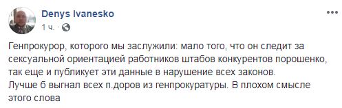 Публикация оперативных данных возмутила пользователей сетей. "Генпрокурор, которого мы заслужили: мало того, что он следит за сексуальной ориентацией работников штабов конкурентов Порошенко, так еще и публикует эти данные в нарушение всех законов. Лучше б выгнал всех п@доров из генпрокуратуры. В плохом смысле этого слова", - пишет Денис Иванеско в Facebook.